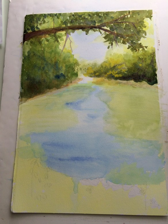 It can be easy to park one’s self in that waiting space. One thing I’ve learned (lesson most learned by mistakes, let me tell you) is to grow creatively as an artist, one needs to lean in and press on. How easy it can be to stay and get lost in that waiting space; park there, paralyzed in the land of fear, doubts, comparisons. How long I stay there in this waiting, is a choice. I’m getting better at this, but like my own self growth, this is a work in progress. Leaning in and pressing on requires trusting in the truth of knowledge that you have either acquired or are currently gaining. When I lean in and press on, I can then begin to see how the final painting may turn out. The trusting and pressing on is growth. Perhaps my final painting will not be what I at first envisioned it will be. Perhaps it will be better, perhaps it will be a painting that I will look back and see something I learned in the process of applying the layers. Moving forward, applying the watercolor, are choices. If I don’t like the waiting process, the blending of the colors I’ve selected or steps I’ve made; I can’t blame anything or anyone else, even if I’d like to. The brush stops with me. Groan.